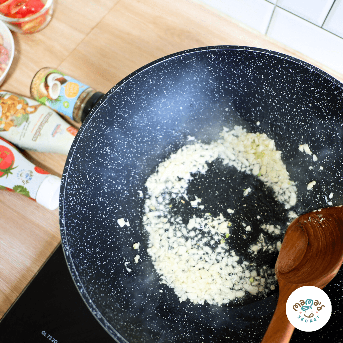 ขั้นตอนที่ 2 ตั้งกระทะ จากนั้นใส่น้ำมัน พอกระทะร้อนนำกระเทียมลงไปผัดให้หอม