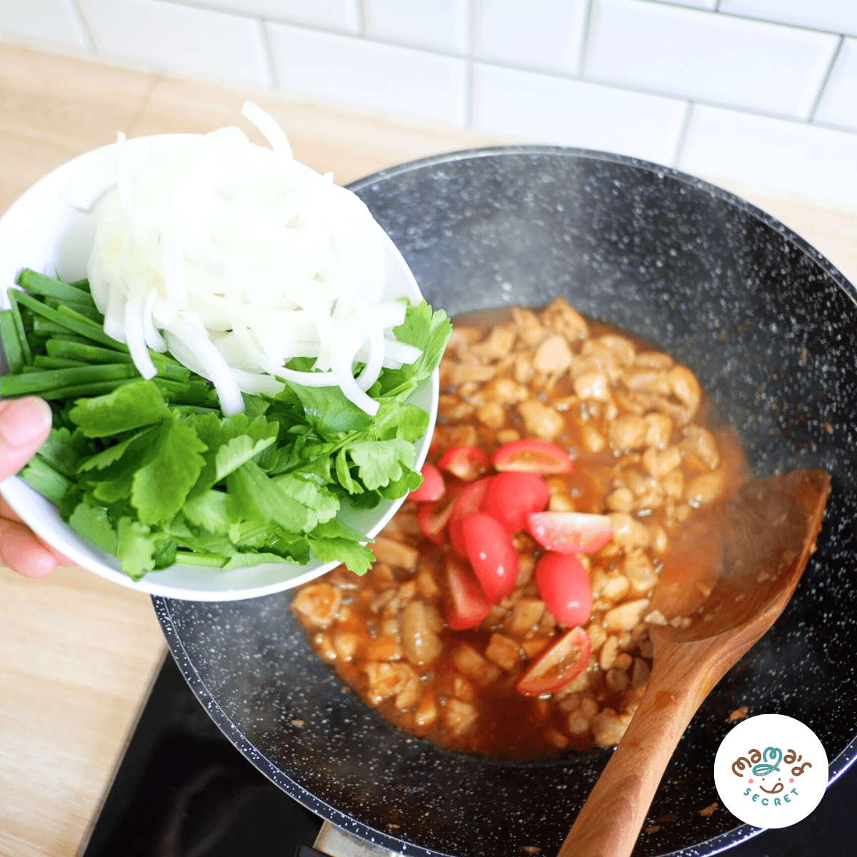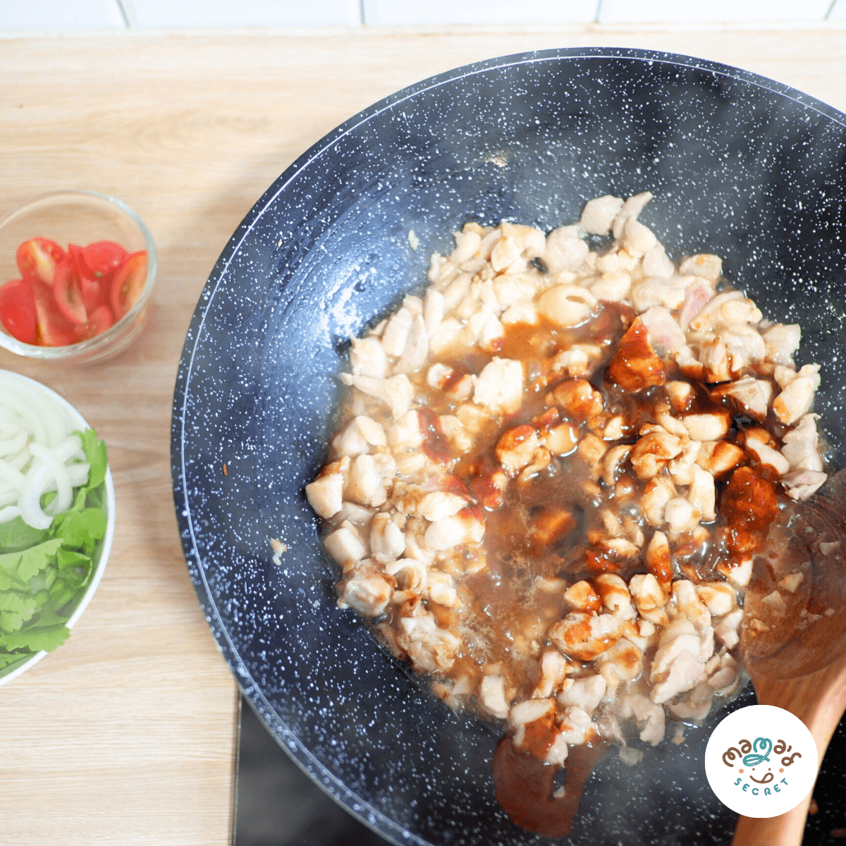 ขั้นตอนที่ 3 นำเนื้อไก่ลงไปผัดให้สุก