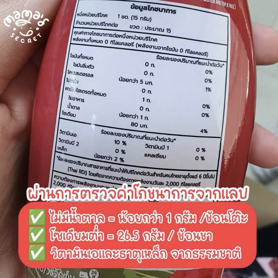 ซึ่งผลตรวจ จะโชว์ที่ตารางโภชนาการเลยว่า 1 ช้อนโต๊ะ ค่าน้ำตาลไม่ขึ้น = น้ำตาลมีน้อยกว่า 1 กรัม / 1 ช้อนโต๊ะ มีโซเดียม 80 กรัม หรือแค่ประมาณ 26.5 กรัมต่อช้อนชาเท่านั้น ( ในขณะที่ค่าโซเดียมของซอสมะเขือเทศทั่วไปในท้องตลาด = 100-150 กรัมต่อ 1 ช้อนโต๊ะ )