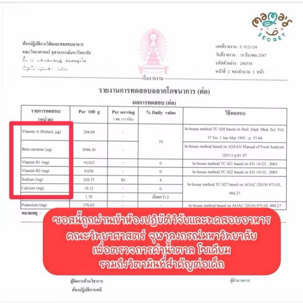 โดยซอสนี้ ถูกนำเข้าแลปห้องปฏิบัติวิจัยและทดสอบอาหาร ของคณะวิทยาศาสตร์ จุฬาลงกรณ์มหาวิทยาลัย เพื่อตรวจหาค่าน้ำตาลและโซเดียม เพื่อให้คุณพ่อคุณแม่มั่นใจว่า ดีต่อสุขภาพลูกจริงๆ รวมถึง ได้มีผลตรวจค่าวิตามินอีกด้วยค่า