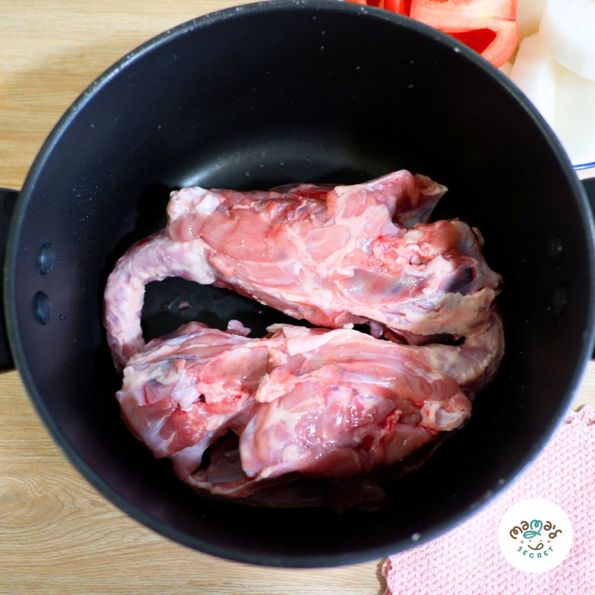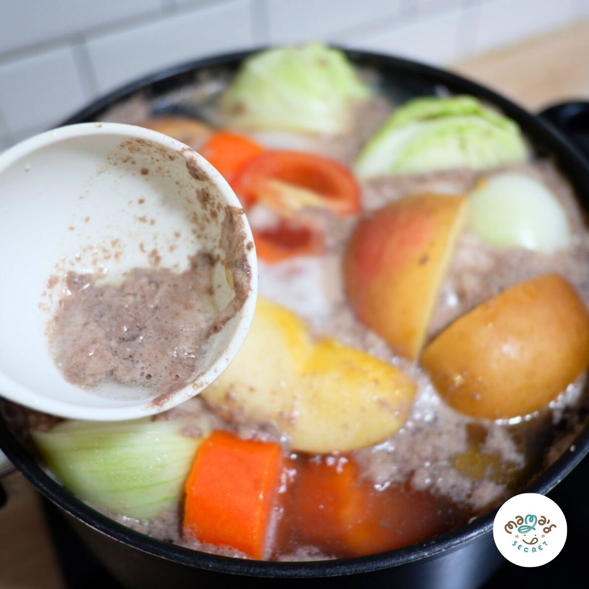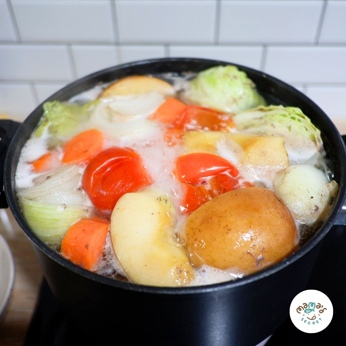 ขั้นตอนที่ 5 นำโครงไก่ และผักผลไม้ที่หั่นไว้ลงในหม้อที่จะทำการต้มน้ำซุป