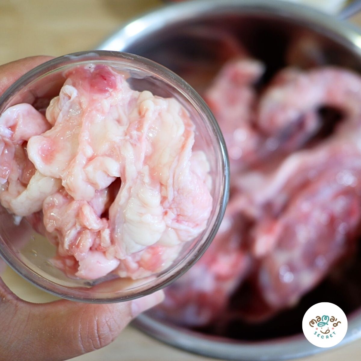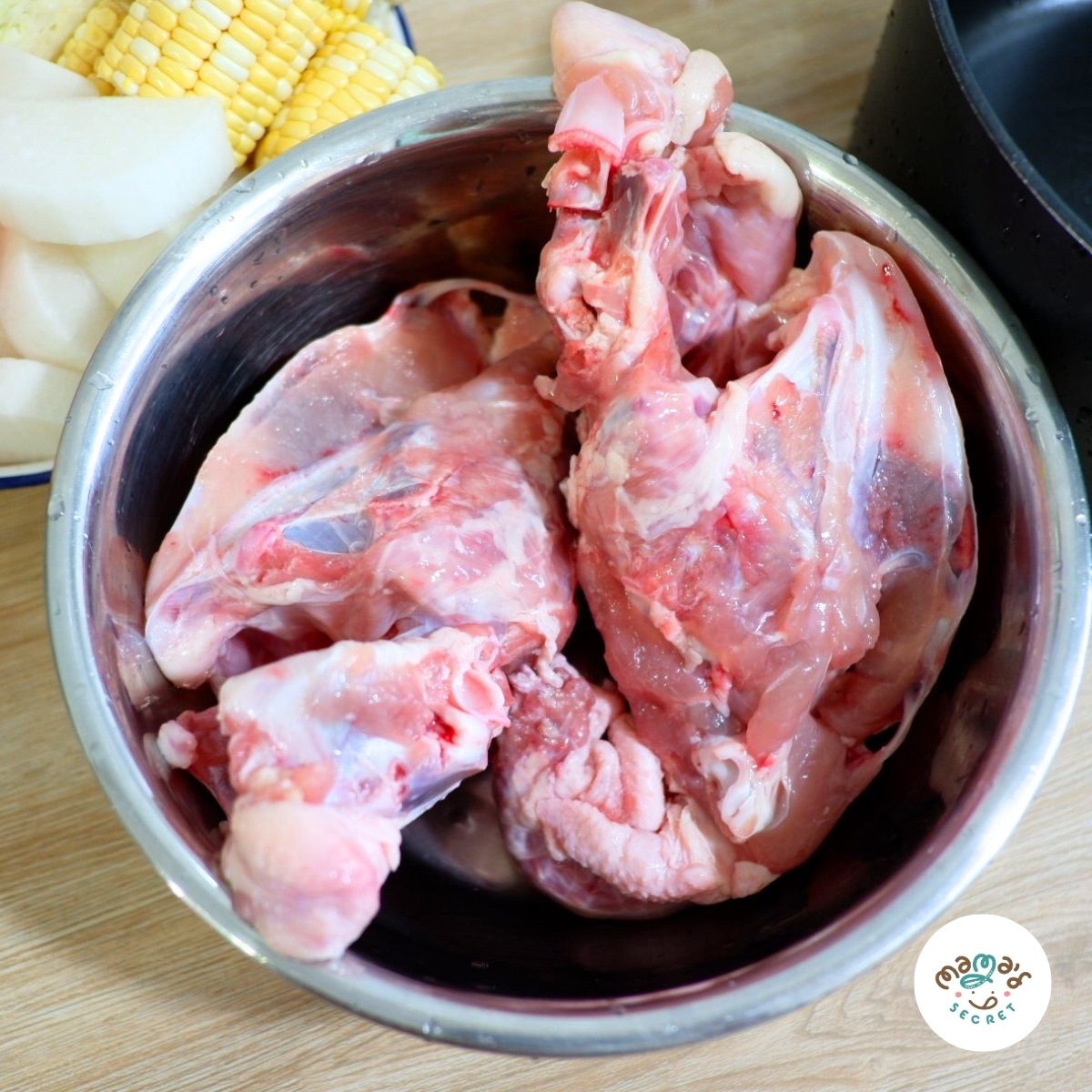 ขั้นตอนที่ 4 เตรียมโครงไก่ ล้างน้ำให้สะอาด จากนั้นตัดส่วนตูดไก่ เลาะเอาหนังไก่ที่คอ และส่วนที่มันๆออก(เลาะออกให้ได้เยอะที่สุดเลย)