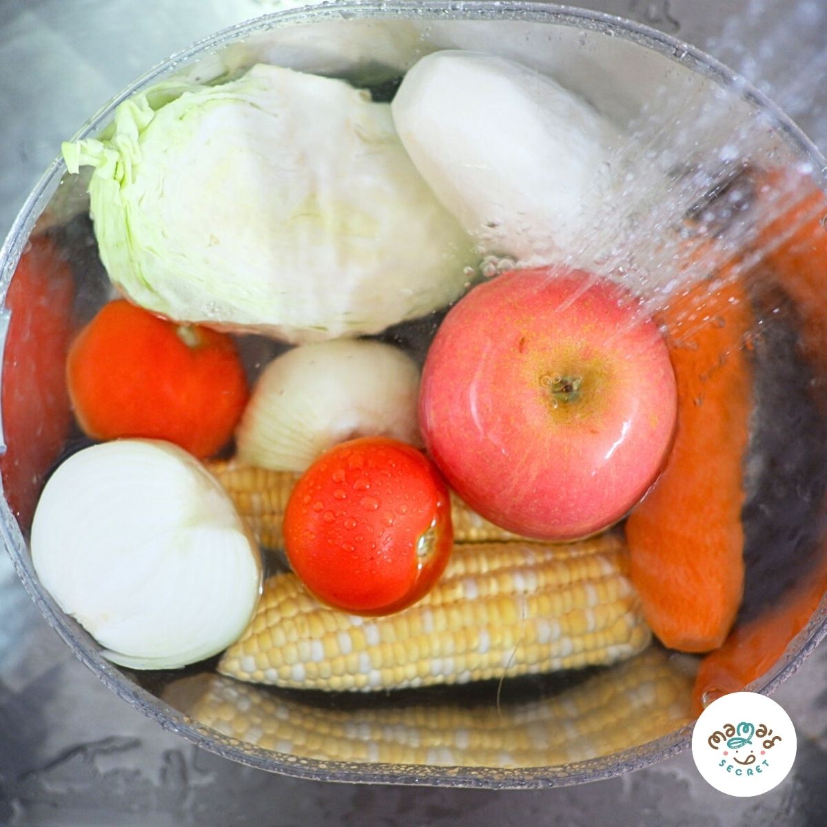 ขั้นตอนที่ 1 เตรียมผักผลไม้ ทำความสะอาดแช่หรือล้างน้ำเกลือ(ใช้เกลือที่ทำอาหาร) ตามด้วยล้างน้ำให้สะอาด พักให้สะเด็ดน้ำ