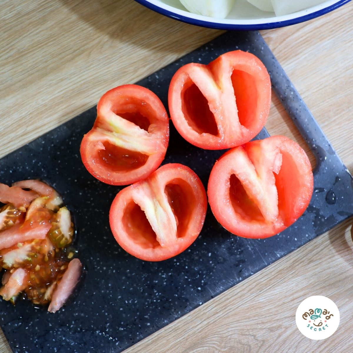 ขั้นตอนที่ 2 หั่นมะเขือเทศที่ล้างแล้ว และคว้านเอาเมล็ดออก ใช้แค่เปลือกและเนื้อของมะเขือเทศ