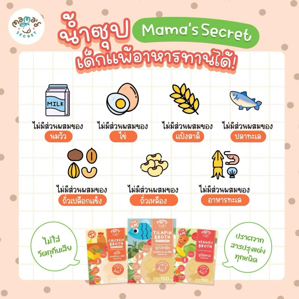 นอกจากน้ำซุป น้ำสต็อกแสนอร่อยแล้ว แบรนด์ Mama’s Secret Family ของเรายังมีสินค้าเพื่อสุขภาพของลูกน้อยและคุณแม่อีกหลากหลายอย่าง เช่น ผงโรยข้าวเด็ก ตัวช่วยเด็กทานยาก นมเขย่าซุปเปอร์ฟู้ดเสริมภูมิคุ้มกัน วิตามินสำหรับคุณแม่ตั้งครรภ์และให้นมบุตร ผลิตภัณฑ์เกี่ยวกับน้ำนมแม่ เป็นต้น